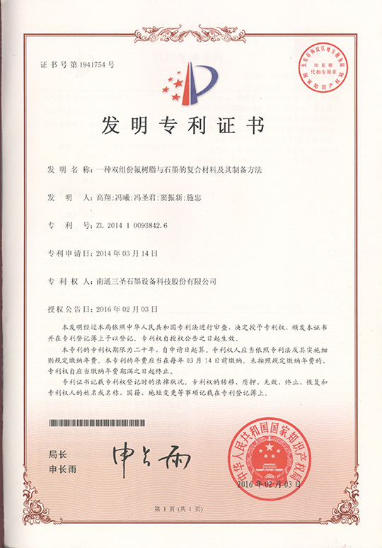 2016年2月18日,南通三圣石墨設(shè)備科技股份有限公司收到國家知識(shí)產(chǎn)權(quán)局的發(fā)明專利證書,該公司的發(fā)明專利"一種雙組份氟樹脂與石墨的復(fù)合材料及其制備方法"獲得了國家授權(quán)。該項(xiàng)專利涉及一種完全意義上的新型氟-石墨復(fù)合材料,該復(fù)合材料既具有石墨優(yōu)良的導(dǎo)熱性能,又具有優(yōu)異的耐腐蝕性能,由該種材料制成的換熱設(shè)備可用于強(qiáng)腐蝕工況條件下的換熱,打破了此前常規(guī)設(shè)備滲透壓力耐受瓶頸,實(shí)現(xiàn)了鋼鐵酸洗工序上酸液換熱設(shè)備的國產(chǎn)化。